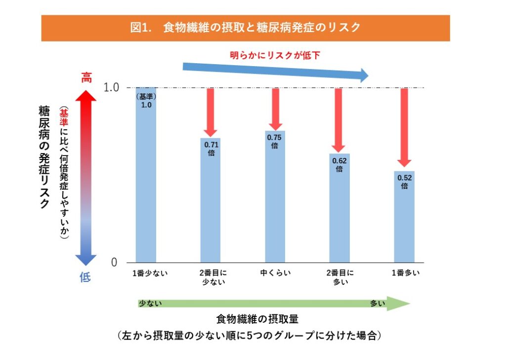 食物繊維は胃から腸への食物の移動時間を遅らせて糖質の吸収を穏やかにします。また、食物繊維をエサにして腸内細菌が生み出す短鎖脂肪酸は、食後の血糖値の急上昇を抑える働きがあります。このような点が、食物繊維をよく摂取することで糖尿病の発症を防ぐ理由と考えられます。